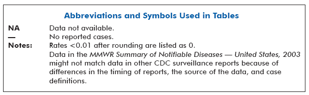 Persons using assistive technology might not be able to fully access information in this file. For assistance, please send e-mail to: mmwrq@cdc.gov. Type 508 Accommodation and the title of the report in the subject line of e-mail. Summary of Notifiable Diseases --- United States, 2003Please note: An erratum has been published for this article. To view the erratum, please click here. Prepared by Division of Public Health Surveillance and Informatics PrefaceThe Summary of Notifiable Diseases --- United States, 2003 contains the official statistics, in tabular and graphic form, for the reported occurrence of nationally notifiable diseases in the United States for 2003. Unless otherwise noted, the data are final totals for 2003 reported as of June 30, 2004. These statistics are collected and compiled from reports sent by state health departments to the National Notifiable Diseases Surveillance System (NNDSS), which is operated by CDC in collaboration with the Council of State and Territorial Epidemiologists (CSTE). The Summary is available at http://www.cdc.gov/mmwr/summary.html. This site also includes publications from past years. The Highlights section presents noteworthy epidemiologic and prevention information for 2003 for selected diseases and additional information to aid in the interpretation of surveillance and disease-trend data. Part 1 contains tables showing incidence data for the nationally notifiable diseases during 2003.* The tables provide the number of cases reported to CDC for 2003, as well as the distribution of cases by month, geographic location, and the patient's demographic characteristics (age, sex, race, and ethnicity). Nationally notifiable diseases that are reportable in <40 states do not appear in these tables. Part 2 contains graphs and maps that depict summary data for certain notifiable diseases described in tabular form in Part 1. Part 3 contains tables that list the number of cases of notifiable diseases reported to CDC since 1970. This section also includes a table enumerating deaths associated with specified notifiable diseases reported to CDC's National Center for Health Statistics (NCHS), during 1996--2001.† The Selected Reading section presents general and disease-specific references for notifiable infectious diseases. These references provide additional information on surveillance and epidemiologic concerns, diagnostic concerns, and disease control activities. BackgroundThe infectious diseases designated as notifiable at the national level during 2003 are listed on page 3. A notifiable disease is one for which regular, frequent, and timely information regarding individual cases is considered necessary for the prevention and control of the disease. This section briefly summarizes the history of the reporting of nationally notifiable diseases in the United States. In 1878, Congress authorized the U.S. Marine Hospital Service (the forerunner of the Public Health Service [PHS]) to collect morbidity reports regarding cholera, smallpox, plague, and yellow fever from U.S. overseas consuls. The intention was to use this information to institute quarantine measures to prevent the introduction and spread of these diseases into the United States. In 1879, a specific Congressional appropriation was made for the collection and publication of reports of these notifiable diseases. Congress expanded the authority for weekly reporting and publication of these reports in 1893 to include data from states and municipal authorities. To increase the uniformity of the data, Congress enacted a law in 1902 directing the Surgeon General to provide forms for the collection and compilation of data and for the publication of reports at the national level. In 1912, in conjunction with PHS, state and territorial health authorities recommended immediate telegraphic reporting of five infectious diseases and the monthly reporting, by letter, of 10 additional diseases. The first annual summary of The Notifiable Diseases in 1912 included reports of 10 diseases from 19 states, the District of Columbia, and Hawaii. By 1928, all states, the District of Columbia, Hawaii, and Puerto Rico were participating in national reporting of 29 specified diseases. At their annual meeting in 1950, state and territorial health officers authorized CSTE to determine which diseases should be reported to PHS. In 1961, CDC assumed responsibility for collecting and publishing data concerning nationally notifiable diseases. The list of nationally notifiable diseases is revised periodically. For example, a disease might be added to the list as a new pathogen emerges, or a disease might be deleted as its incidence declines. Public health officials at state health departments and CDC continue to collaborate in determining which diseases should be nationally notifiable. CSTE, with input from CDC, makes recommendations annually for additions and deletions. Although disease reporting is mandated by legislation or regulation at the state and local levels, state reporting to CDC is voluntary. Thus, the list of diseases considered notifiable varies slightly by state. All states report the internationally quarantinable diseases (i.e., cholera, plague, and yellow fever) in compliance with the World Health Organization's International Health Regulations. * Because no cases of anthrax, Powassan encephalitis/meningitis, western equine encephalitis, paralytic poliomyelitis, or yellow fever were reported in the United States during 2003, these diseases do not appear in the tables in Part I. For certain other nationally notifiable diseases, incidence data were reported to CDC but are not included in the tables or graphs of this Summary. Data on chronic hepatitis B and hepatitis C virus infection (past or present) are undergoing data-quality review. Data on ehrlichiosis attributable to other or unspecified agents are being withheld from publication pending the outcome of discussions about the reclassification of certain Ehrlichi