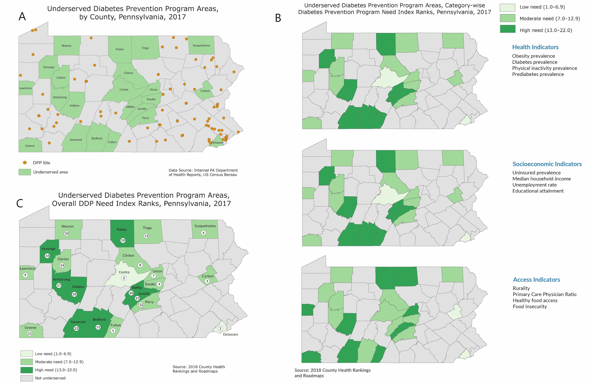 Map A shows underserved DPP areas, counties that do not have any CDC-recognized DPPs and have a population of 10,000 or more, in Pennsylvania. Map B shows the CDNIRs for each underserved county within Pennsylvania in 3 risk factor categories; health, socioeconomic, and access indicators. Numbers indicate ranking on 3 hierarchical tiers according to need for DPP: low (range, 1.0–6.9), moderate (range, 7.0–12.9), and high (range, 13.0–22.0) CDNIRs are an average of the county ranks for each indicator in the 3 categories. Map C shows the ODNIRs for the 22 underserved areas. ODNIR is a weighted average of 3 CDNIRs: health, socioeconomic, and access indicators. Abbreviations: CDC, Centers for Disease Control and Prevention; CDNIRs, Category-wise DPP Need Index Ranks; DPP, Diabetes Prevention Program; ONDIRs, Overall DPP Need Index Ranks; PADOH, Pennsylvania Department of Health.