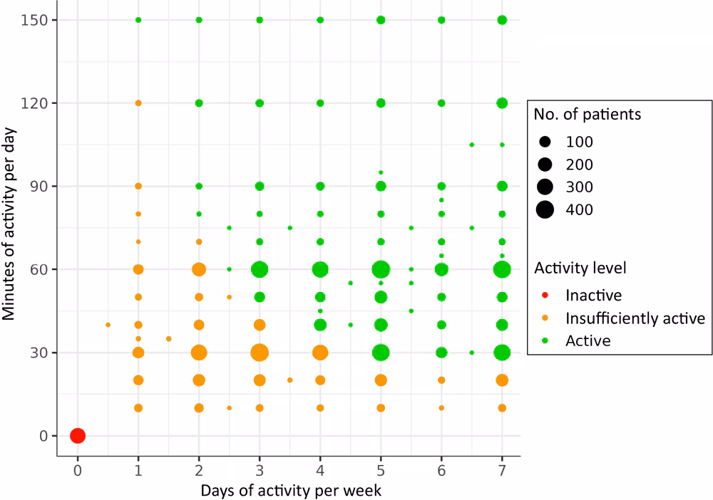 Of the 7,261 patients in the EVS cohort, 4,382 (60%) patients were considered active, 2,607 (36%) were insufficiently active, and 272 (4%) were inactive. Insufficiently active patients most commonly reported engaging in 2 or 3 days of activity per week and 30 minutes of activity per day. Active patients most commonly reported engaging in 5 days of activity per week and 60 minutes of activity per day (Figure).