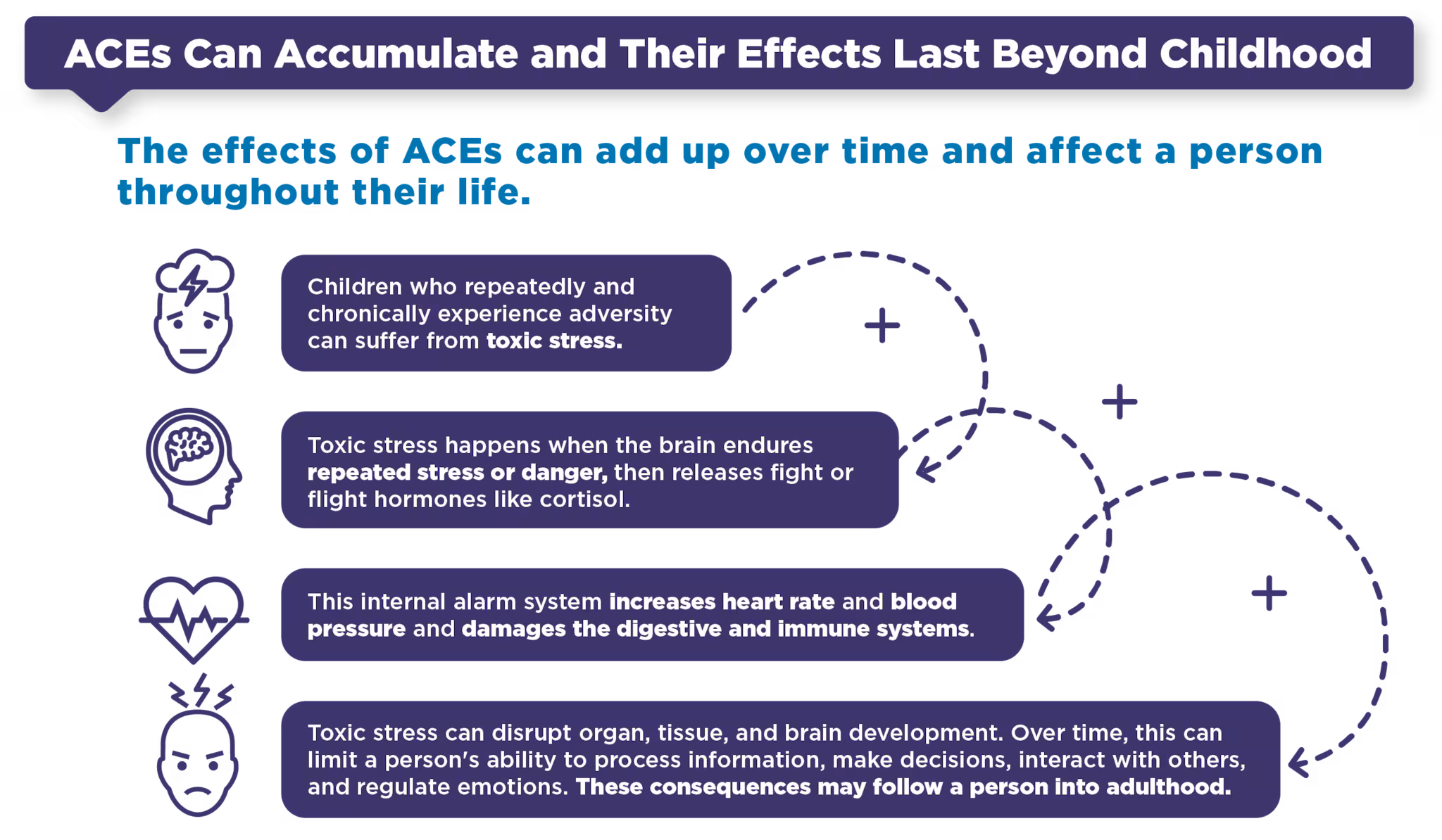 Preventing Adverse Childhood Experiences Trainings: These online trainings are designed to help users understand, recognize, and prevent ACEs from occurring in the first place. There is an introductory Training Module as well as modules with information for professionals working directly with and on behalf of kids and families.