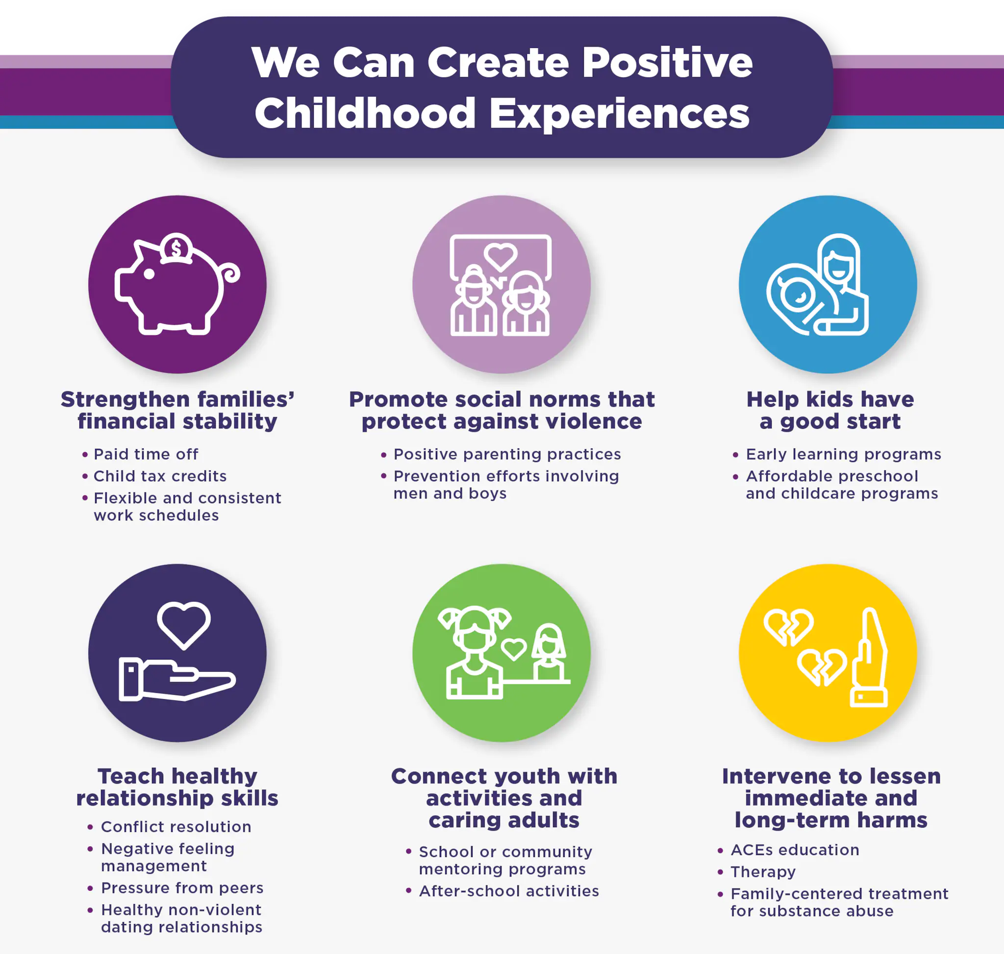 Adverse Childhood Experiences Prevention Resource for Action: This is a resource to help states and communities leverage the best available evidence to prevent ACEs from happening in the first place as well as lessen harms when ACEs do occur. It features six strategies drawn from the CDC Resources for Action, formerly known as, “technical packages.”