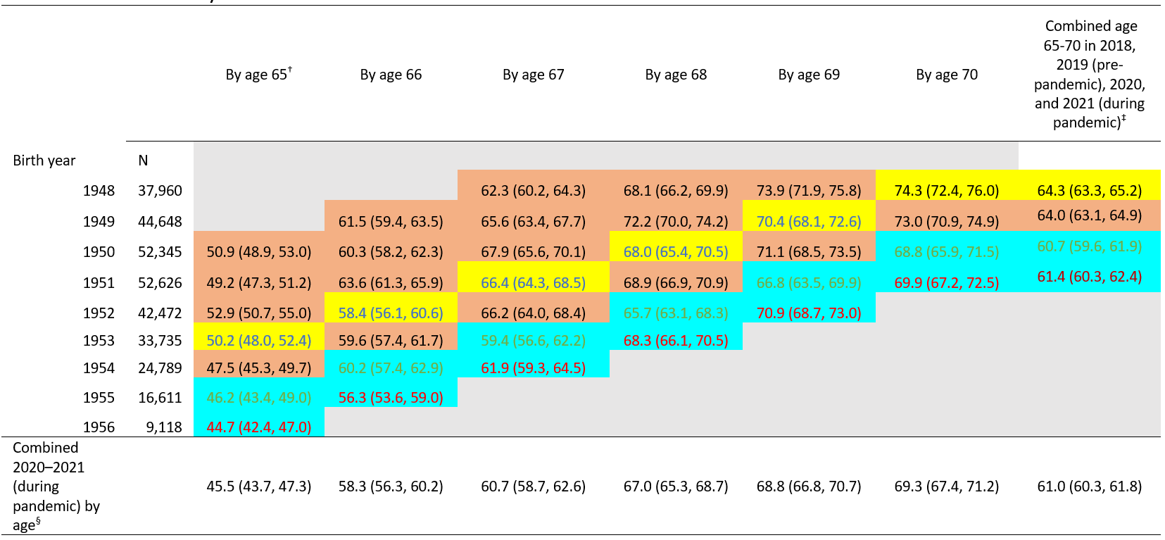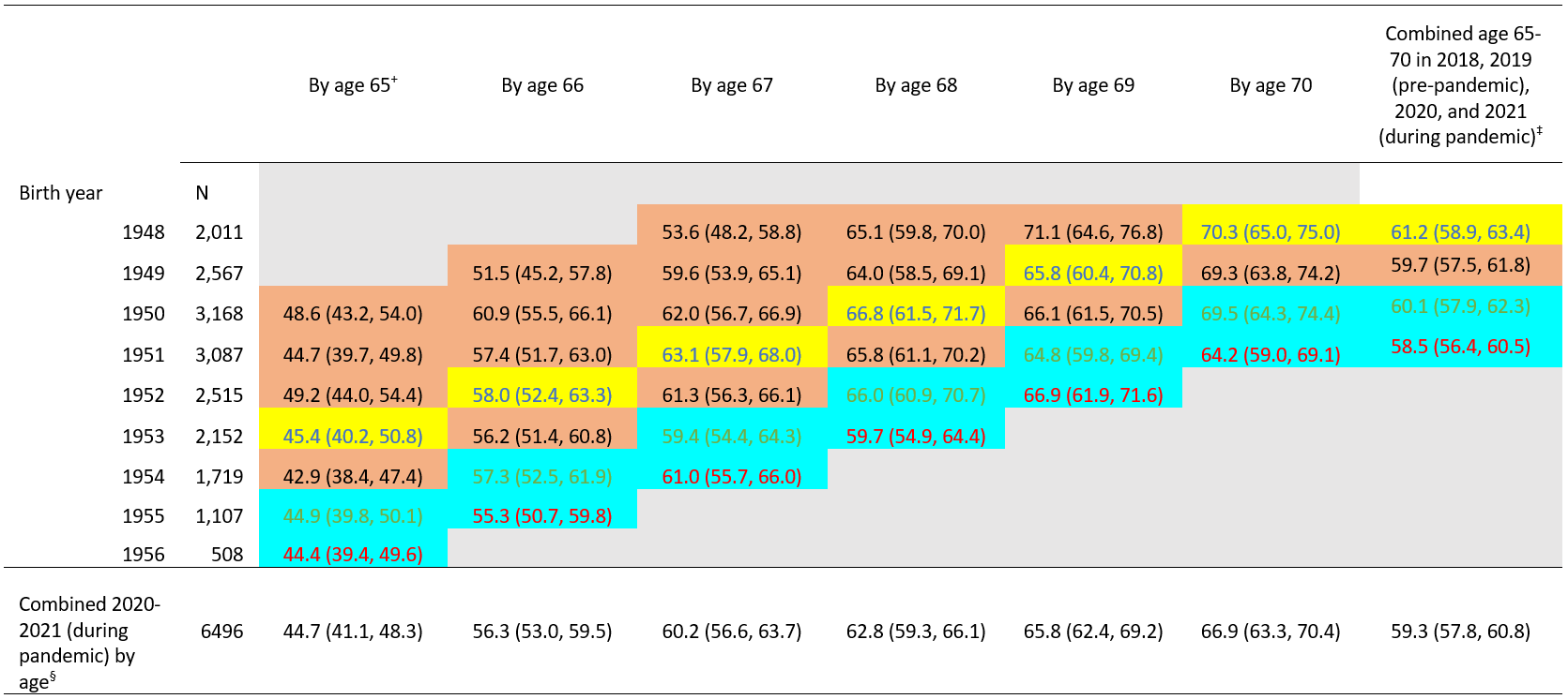 § Combined 2020–2021 (during pandemic) by age, persons with the indicated birth year (rows) reached the age indicated (columns) in 2020–2021 (combined two blue cell shadings) (e.g., for coverage by age 65 years, people born in 1955 or 1956 reached 65 in 2020 or 2021, which was during pandemic).