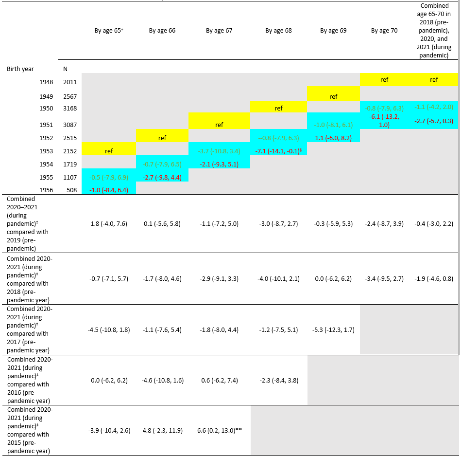 *People in these reference birth years reached the given age in 2018 (pre-pandemic year) (e.g., for coverage by age 66 years, people born in 1952 reached 66 in 2018, which was before the pandemic). The pre-pandemic year (reference: yellow cell shading) is compared to pandemic years (2020 and 2021, blue cell shading; or 2020–2021, combined two blue cell shadings).