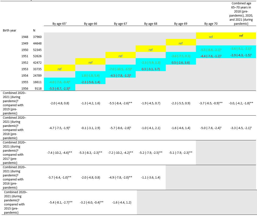 * People in these reference birth years reached the given age in 2018 (pre-pandemic year) (e.g., for coverage by age 66 years, people born in 1952 reached 66 in 2018, which was before the pandemic). The pre-pandemic year (reference: yellow cell shading) is compared to pandemic years (2020 and 2021, blue cell shading; or 2020–2021, combined two blue cell shadings).