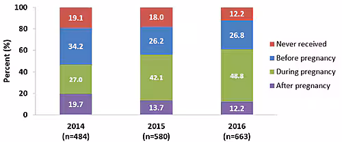 - The proportion of recently pregnant women who received their most recent Tdap vaccination before or after pregnancy was similar in 2016 (39.0%) compared with 2015 (39.9%).