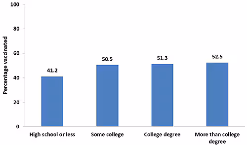 - In 2016, Tdap vaccination coverage was lower among pregnant women with a high school diploma or less (41.2%) compared with women with some college education (50.5%), women with a college degree (51.3%), and women with more than a college degree (52.5%).