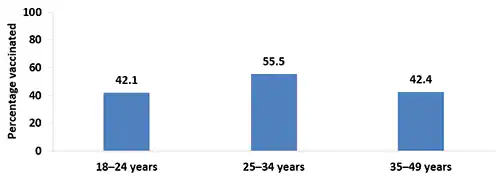 - In 2017, pregnant women 18–24 years (42.1%) and 35–49 years (42.4%) were less likely to be vaccinated than pregnant women 25–34 years (55.5%).