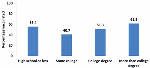 - In 2017, Tdap vaccination coverage during pregnancy was higher among women with more than a college degree (61.5%) compared with women with a college degree (51.3%), women with some college education (40.7%), and women with a high school diploma or less (55.4%). Women with some college education (40.7%) had the lowest coverage.