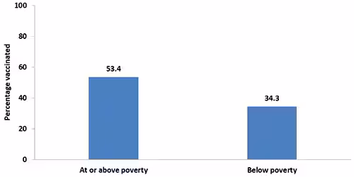- In 2017, pregnant women who were living below the poverty level had lower vaccination coverage (34.3%) compared with women who were living at or above the poverty level (53.4%).