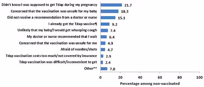 - Most commonly reported as a main reason for not receiving Tdap vaccination were “I didn’t know that I was supposed to get the Tdap vaccination during my most recent pregnancy” (21.7%) and “I was concerned that the vaccination was unsafe for my baby” (18.3%).