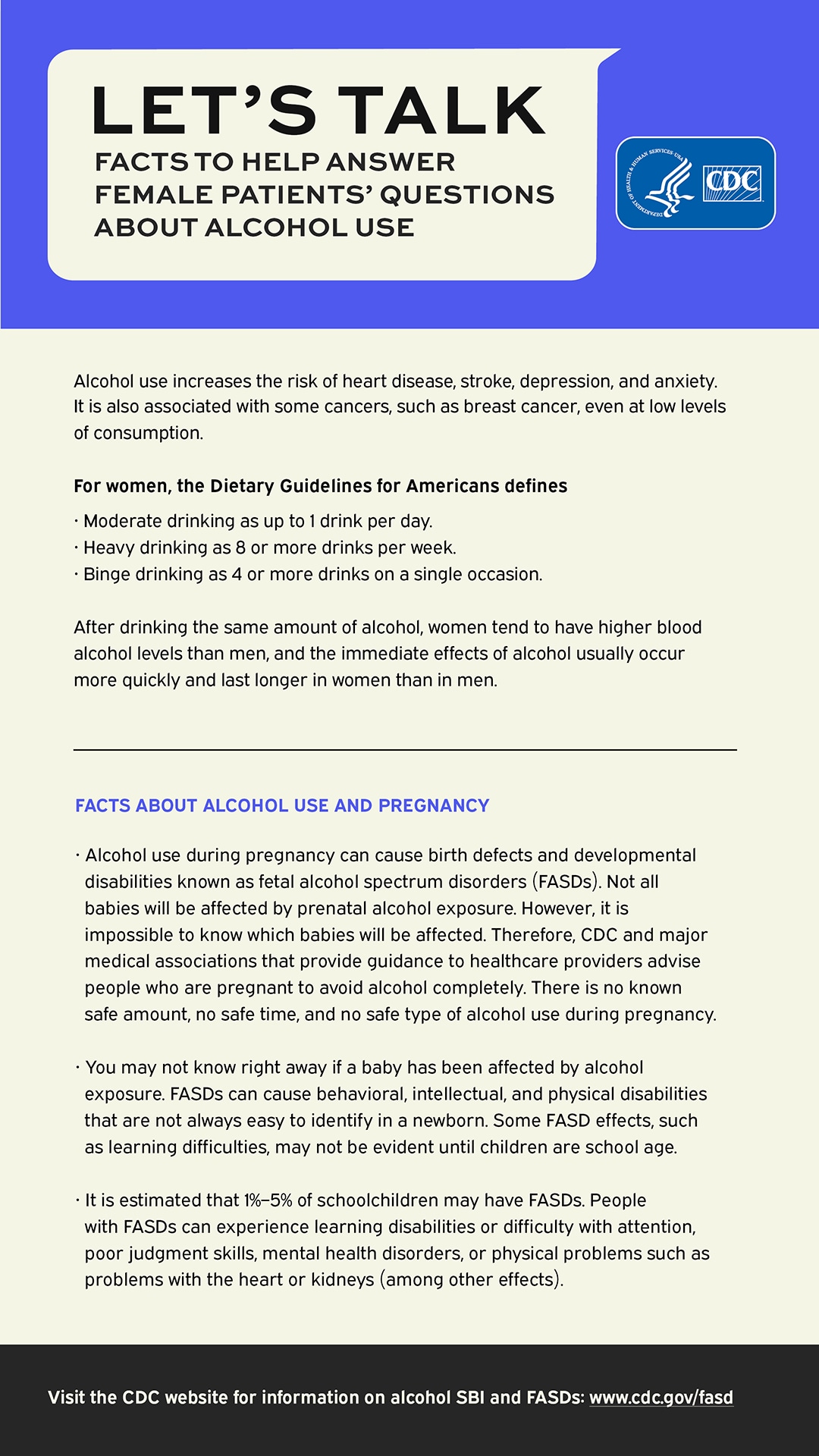 Original site: www.cdc.gov/alcohol-pregnancy/hcp/toolkit/facts-to-help-female-patients-understand-health-impacts-of-alcohol.html | RestoredCDC.org is an independent project, not affiliated with CDC or any federal entity. Visit CDC.gov for free official information. Due to archival on January 6, 2025, recent outbreak data is unavailable. Videos are not restored. Access data.restoredcdc.org for restored data. Use of this site implies acceptance of this disclaimer.