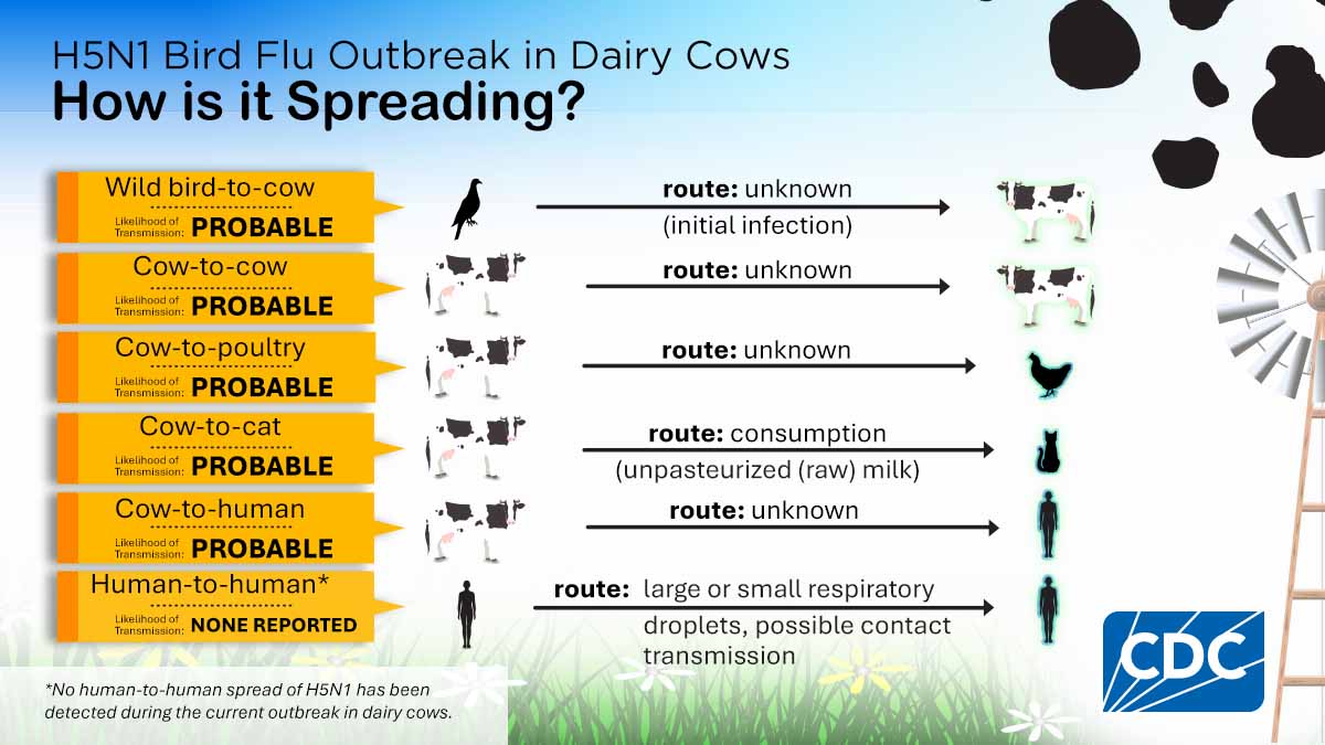 Wondering how #H5N1 bird flu is spreading in dairy cows? While the current risk to most people from H5N1 bird flu is low, people who have contact with infected or potentially infected animals are at higher risk and should take actions to protect themselves. Link in bio to stay up to date on the current H5N1 bird flu situation.