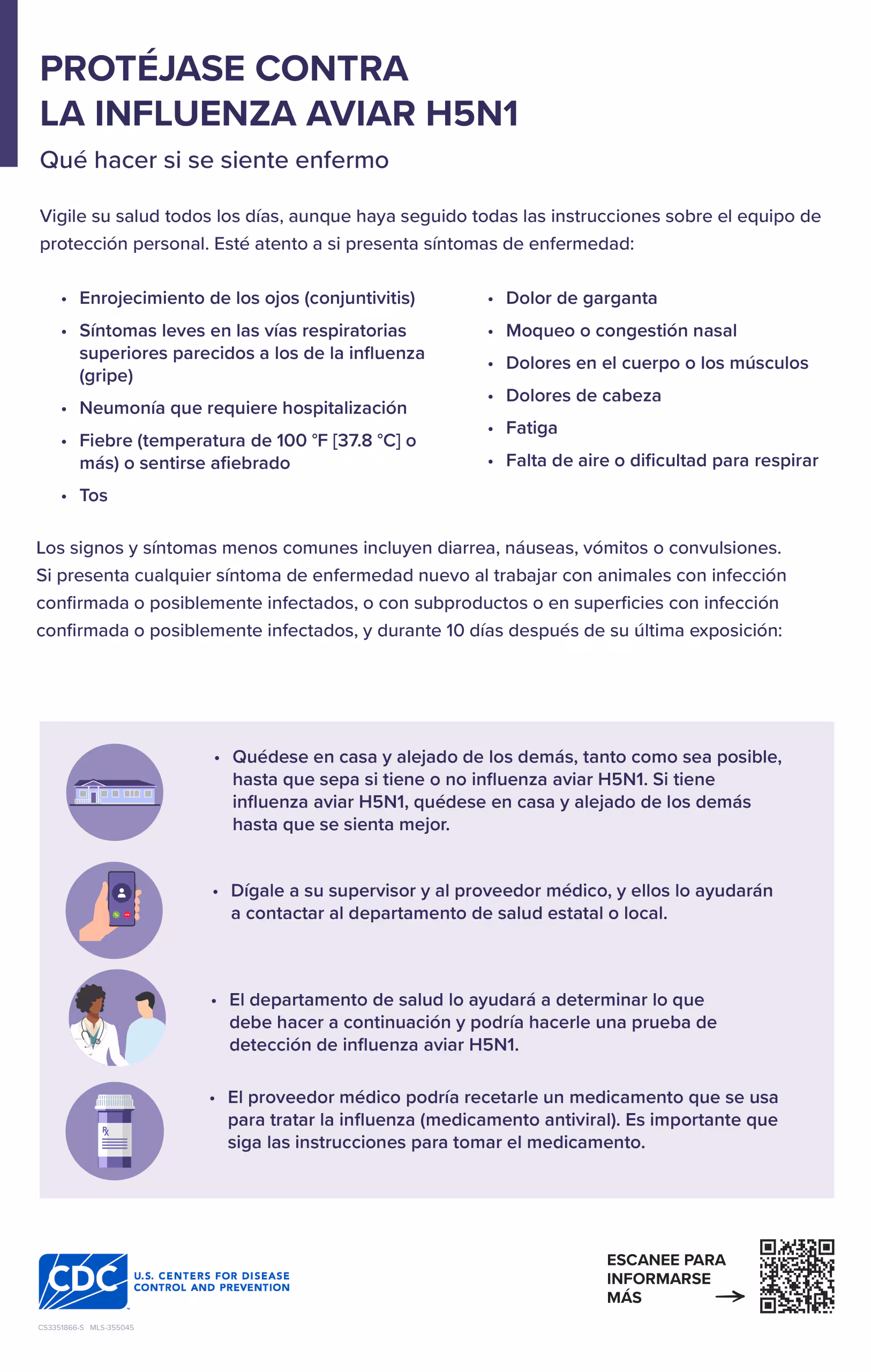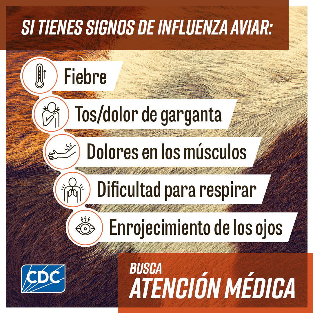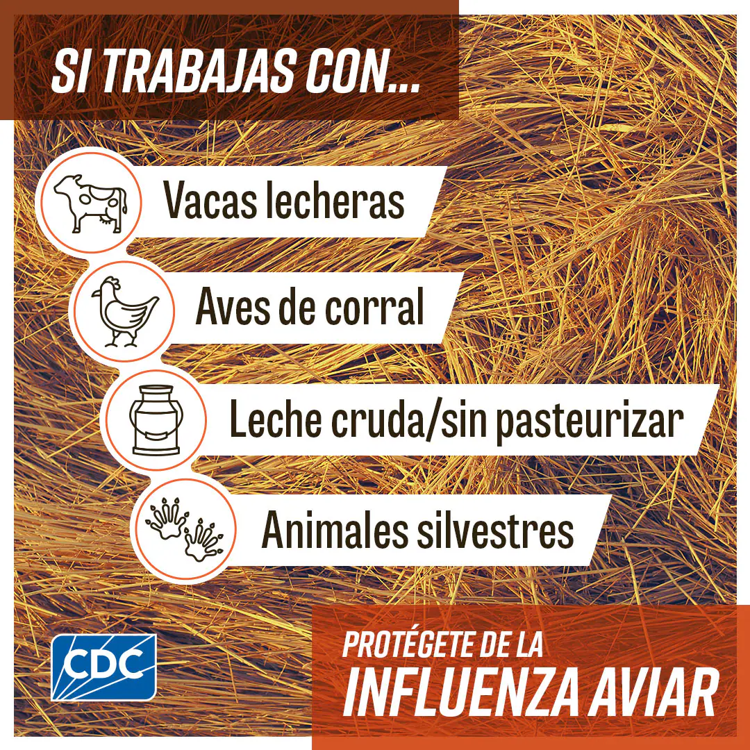 La influenza aviar está propagándose en aves de corral y vacas. Las personas también pueden infectarse. Cuídate al trabajar con animales que podrían estar infectados. Toma estas precauciones al trabajar cerca de animales: https://bit.ly/4cAhJH6
