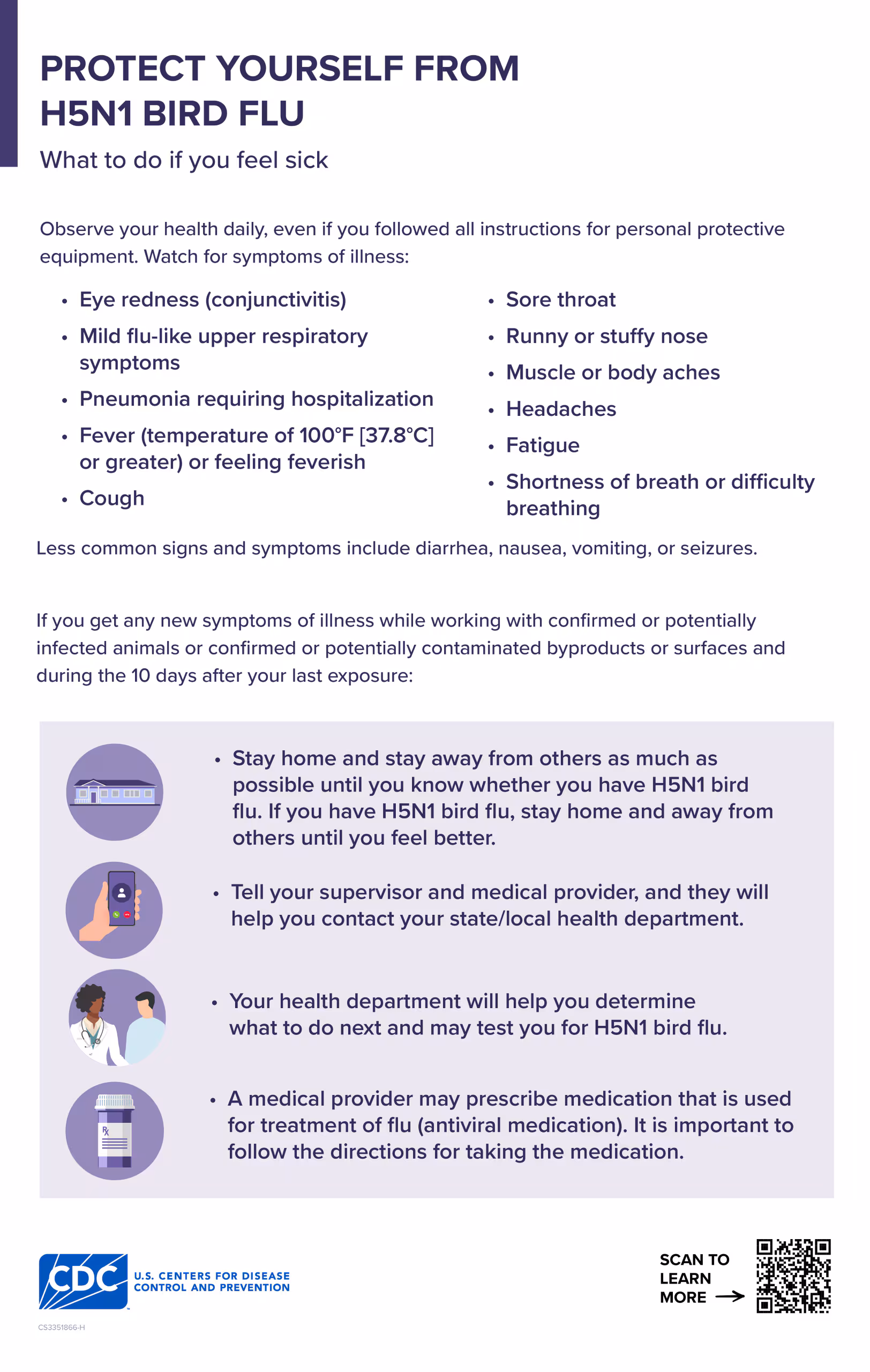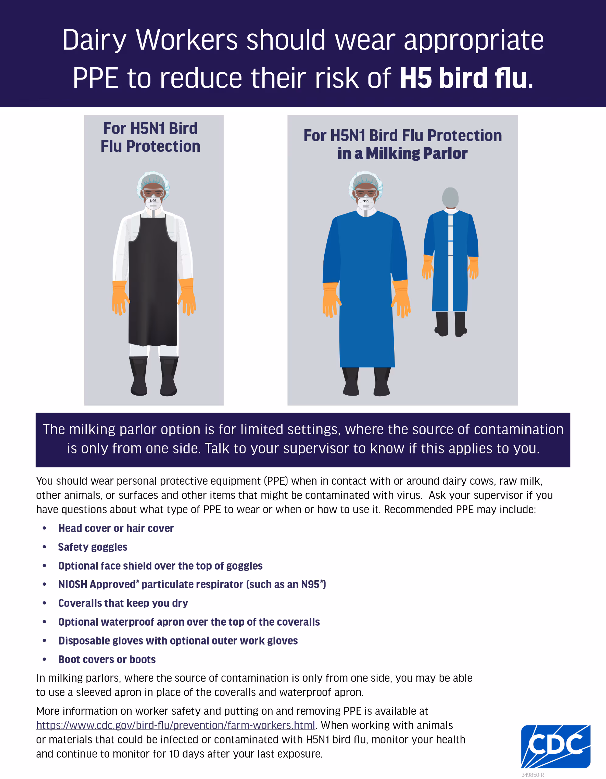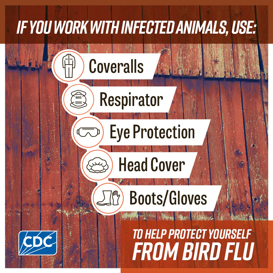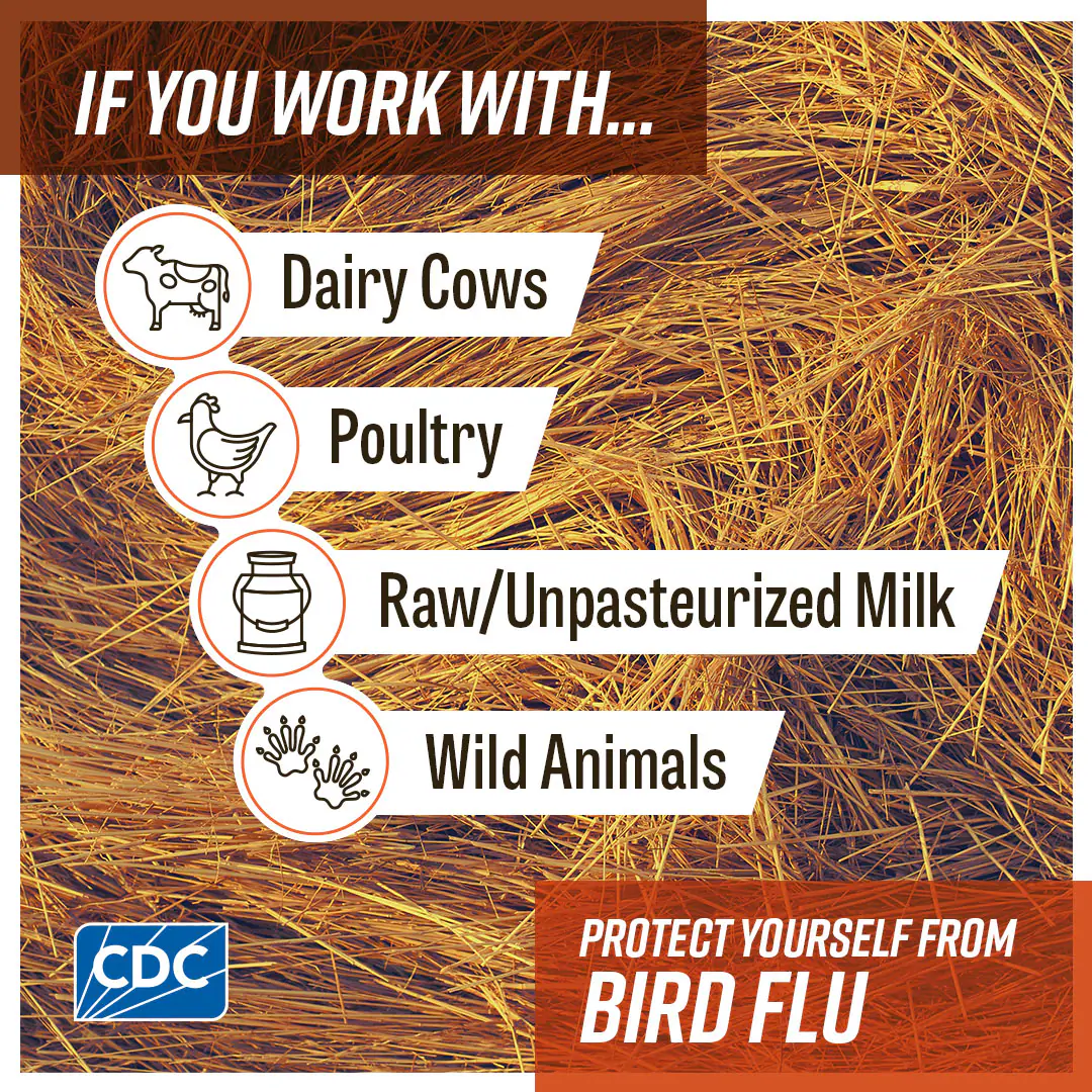 If you work with dairy cows or other animals that could be infected with H5N1 bird flu, find out how to reduce your risk of infection. CDC has information for farm workers exposed to H5N1 bird flu in dairy cows or other animals. https://www.cdc.gov/bird-flu/prevention/farm-workers.html