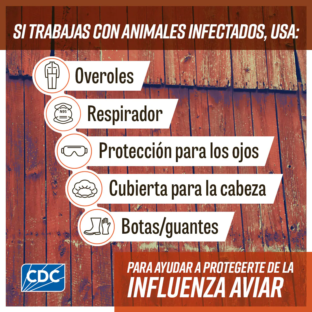 Hay brotes actuales de influenza aviar en aves de corral y silvestres en los EE. UU. Si trabajas con aves infectadas, tienes un riesgo mayor de exposición a la influenza aviar. Los CDC recomiendan que los trabajadores avícolas tomen precauciones: