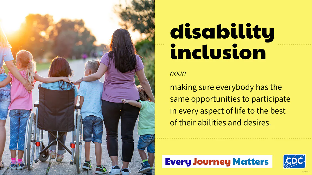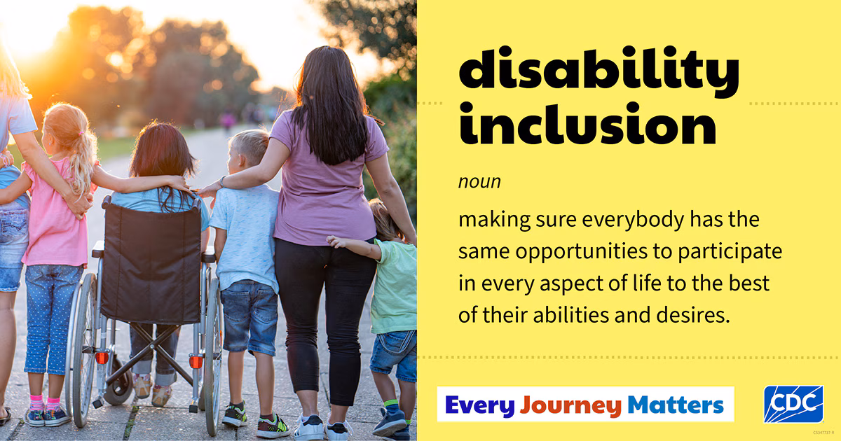 Original site: www.cdc.gov/birth-defects/php/communication-resources/disability-inclusion.html | RestoredCDC.org is an independent project, not affiliated with CDC or any federal entity. Visit CDC.gov for free official information. Due to archival on January 6, 2025, recent outbreak data is unavailable. Videos are not restored. Access data.restoredcdc.org for restored data. Use of this site implies acceptance of this disclaimer.