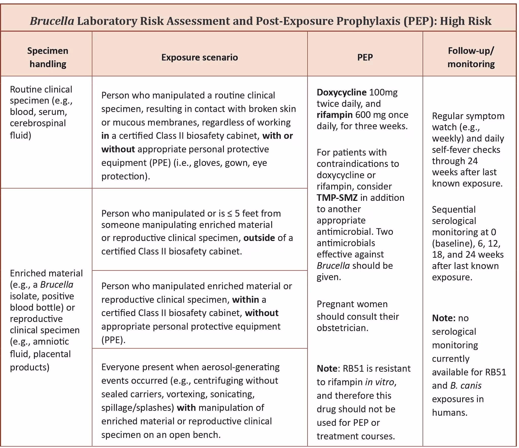 Workers with high-risk exposures should begin antimicrobial post-exposure prophylaxis (PEP) as soon as possible to prevent Brucella infection. Prophylaxis can begin up to 24 weeks after exposure. PEP is generally not recommended for low-risk exposures, though it may be considered on a case-by-case basis. PEP courses should include a minimum of 21 days of: