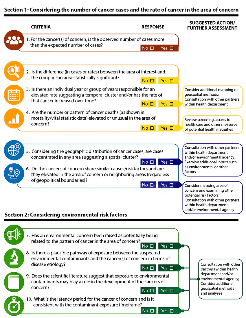 Ten criteria are presented in two sections. Section 1 includes six criteria, each with a yes or no answer, when considering the number of cancer cases and the rate of cancer in the area of concern. Section 2 presents four criteria for considering environmental risk factors: