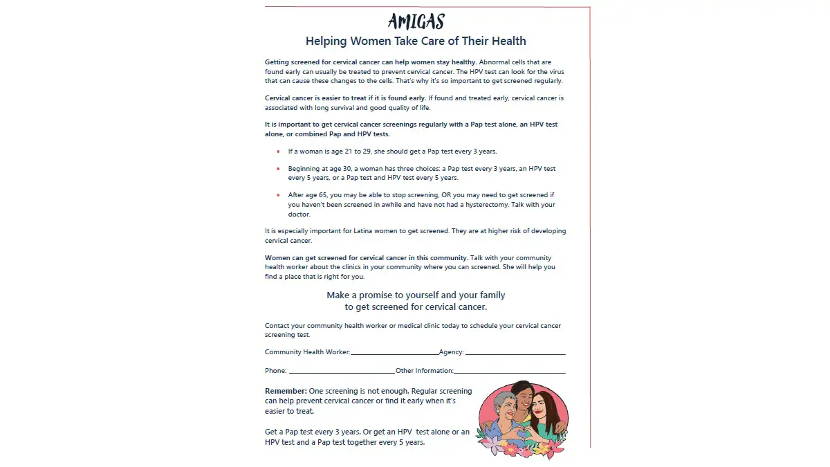 Community health workers can give women a copy of the handout at the end of an AMIGAS session. The handout will help women remember the information you shared with them. It will also be useful for women to use to share with their friends and family about cervical cancer and cervical cancer screening.