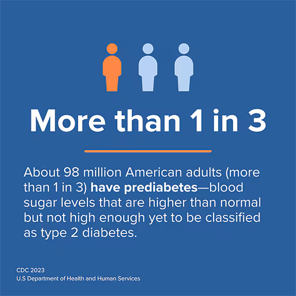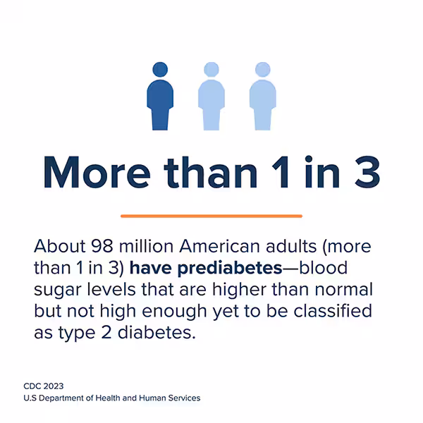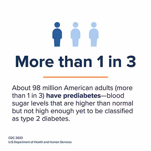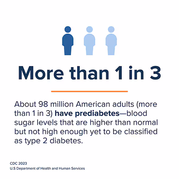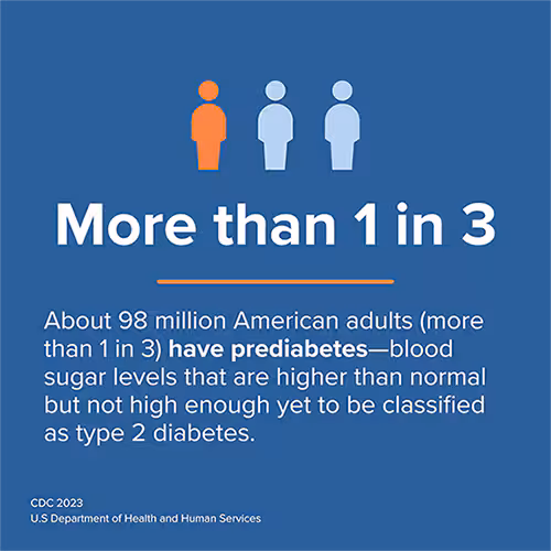 - Graphic text: About 98 million American adults (more than 1 in 3) have prediabetes—blood sugar levels that are higher than normal but not high enough yet to be classified as type 2 diabetes.