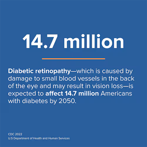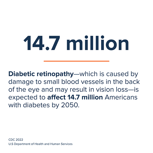 - Graphic text: Diabetic retinopathy—which is caused by damage to small blood vessels in the back of the eye and may result in vision loss—is expected to affect 14.7 million Americans with diabetes by 2050.