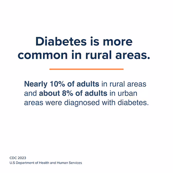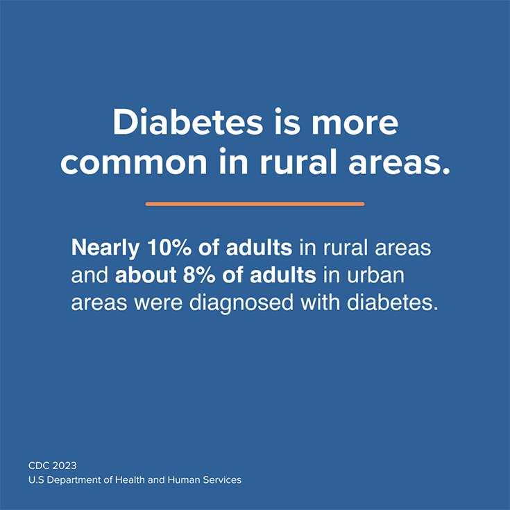 - Graphic text: Diabetes is more common in rural areas. Nearly 10% of adults in rural areas and about 8% of adults in urban areas were diagnosed with diabetes.