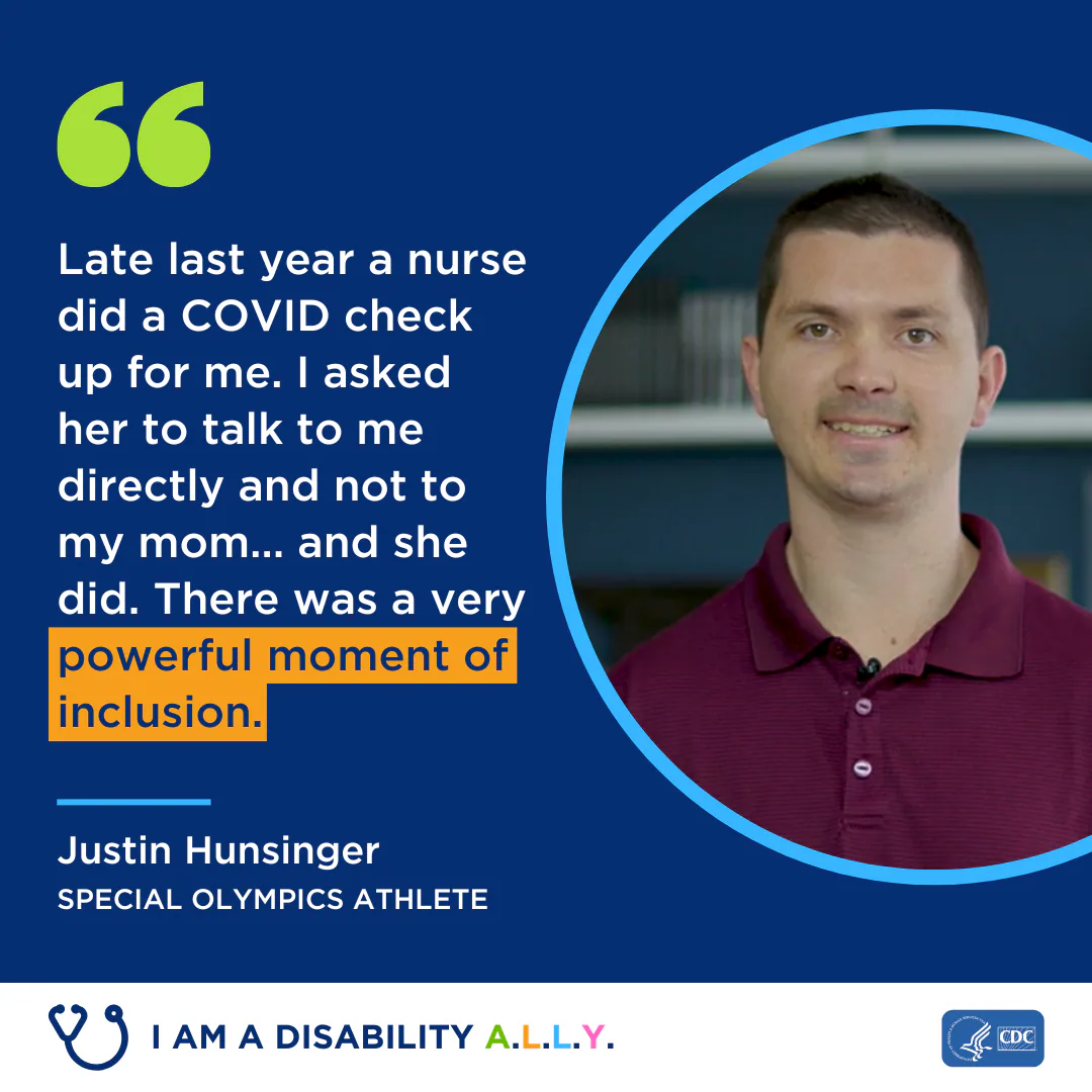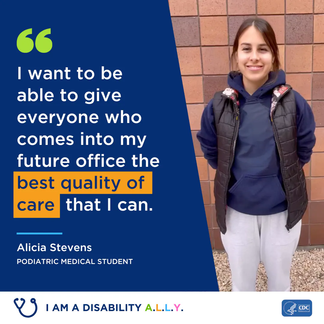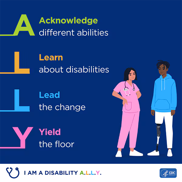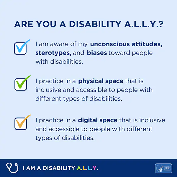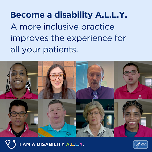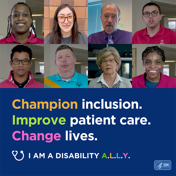 Use the graphics and videos below and join Centers for Disease Control and Prevention (CDC) in championing disability allyship by sharing these digital materials within your health system and community.
