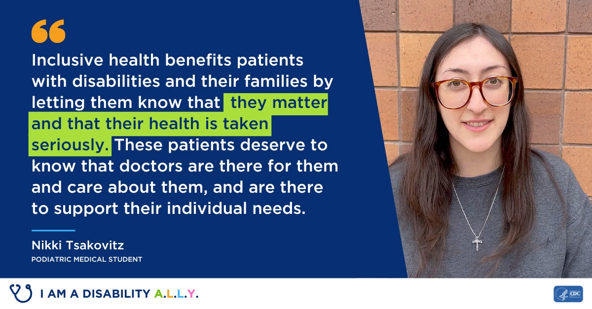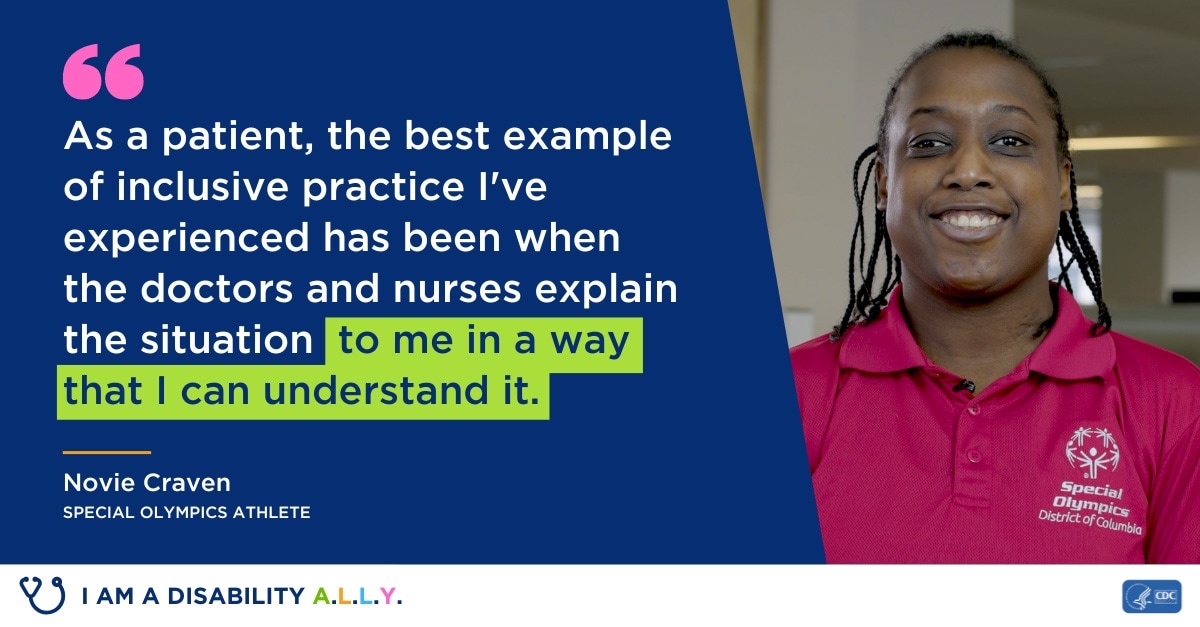 - Listen to stories from people with disabilities and healthcare providers about the importance and impact of providing an inclusive environment.