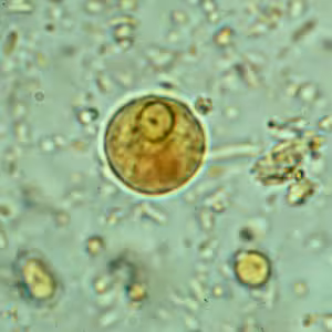 Mature Entamoeba histolytica/Entamoeba dispar cysts have 4 nuclei that characteristically have centrally-located karyosomes and fine, uniformly distributed peripheral chromatin. Cysts usually measure 12 to 15 µm.