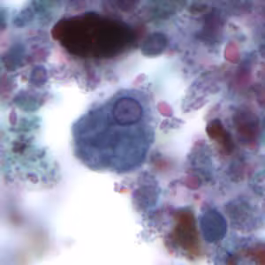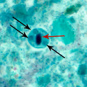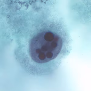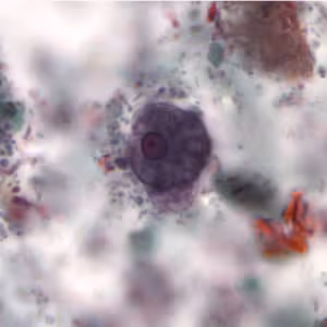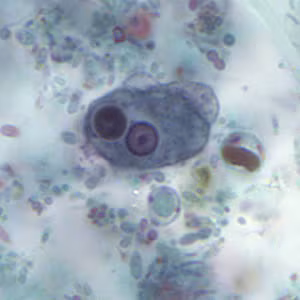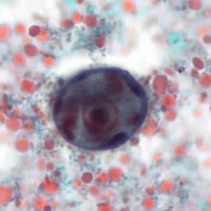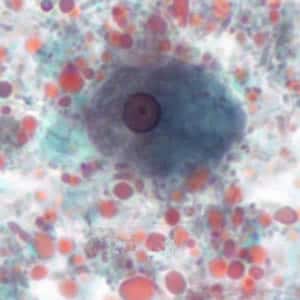 Pathogenic Entamoeba trophozoites have a single nucleus, which have a centrally placed karyosome and uniformly distributed peripheral chromatin. The cytoplasm has a granular or “ground-glass” appearance. Trophozoites usually measure 15 to 20 µm (range 10 to 60 µm), tending to be more elongated in diarrheal stool.