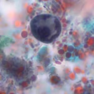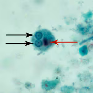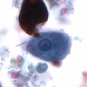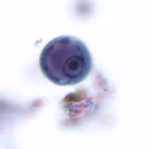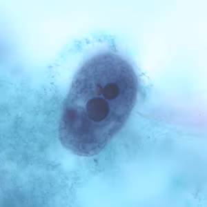 Pathogenic Entamoeba trophozoites have a single nucleus, which have a centrally placed karyosome and uniformly distributed peripheral chromatin. This typical appearance of the nucleus is not always observed as some trophozoites can have nuclei with an eccentric karyosome and unevenly distributed peripheral chromatin. The cytoplasm has a granular or “ground-glass” appearance. Trophozoites usually measure 15 to 20 µm (range 10 to 60 µm), tending to be more elongated in diarrheal stool.