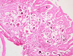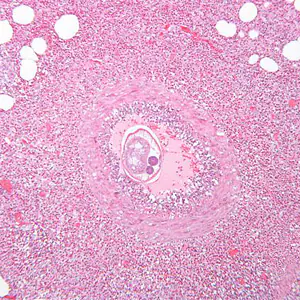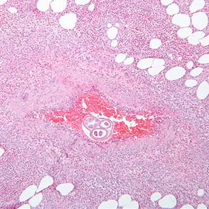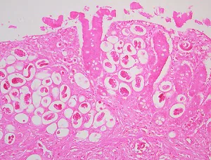 . The presence of larvae, adult worms, and eggs causes a local inflammatory reaction in the intestinal wall. Parasites and eggs are usually degenerated by this host reaction, and eggs do not appear to be shed in human stool.