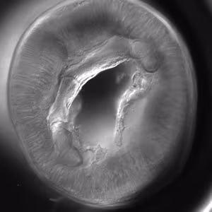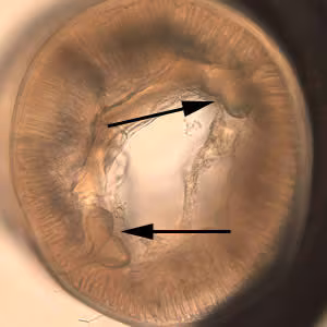 Anterior end of Pseudoterranova sp. The red arrow indicates the intestinal cecum.