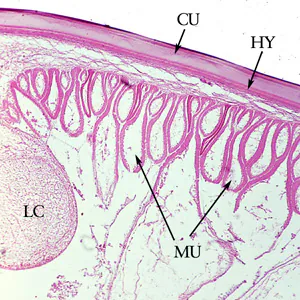 Adults of Ascaris lumbricoides are large roundworms. Females measure 20–35 cm long with straight taisl; males are smaller at 15–31 cm and tend to have curved tails. Adults of both sexes possess three “lips” at the anterior end of the body.