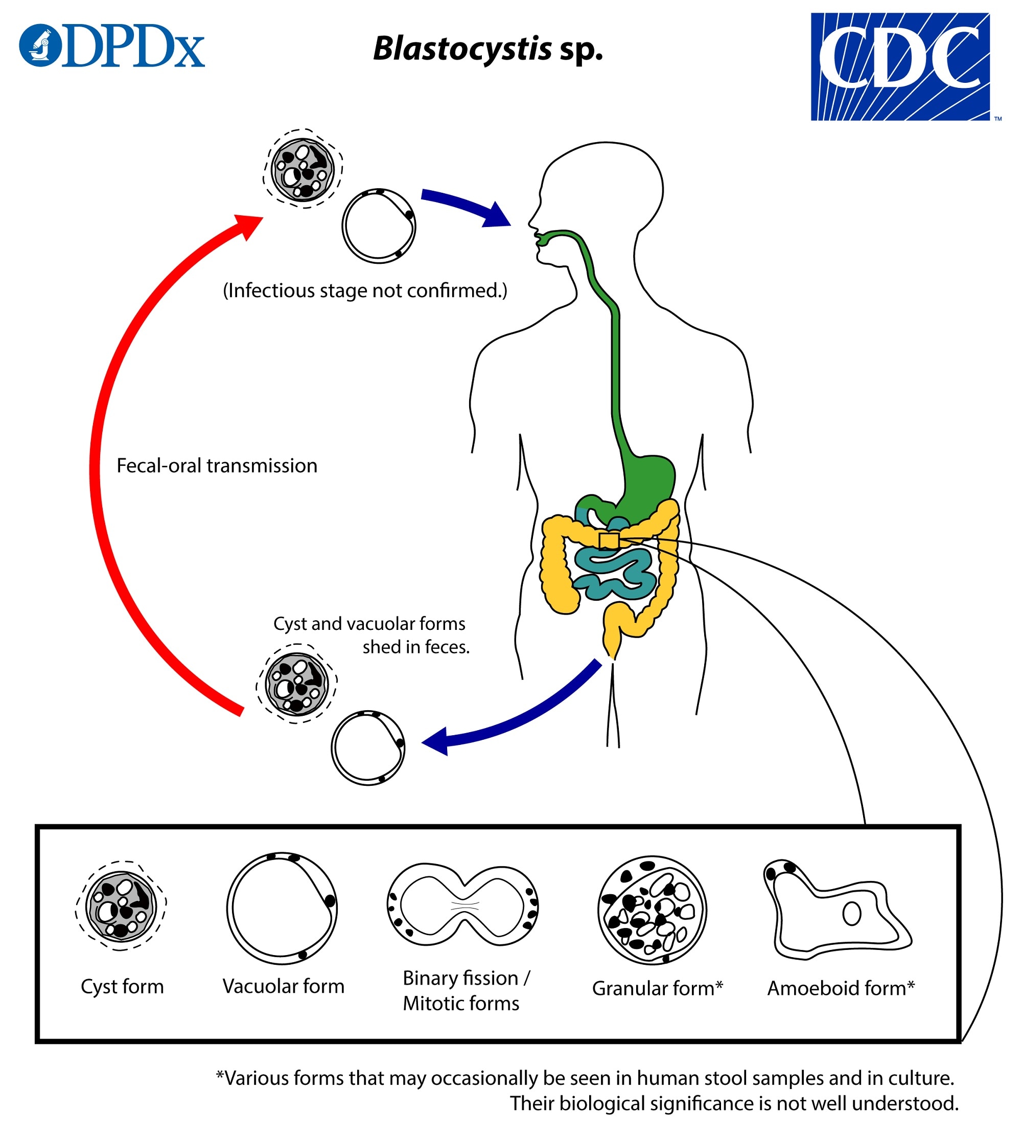 The life cycle of Blastocystis sp. is not yet understood, including the infectious stage and whether (and which of the) various morphologic forms of this polymorphic organism that have been identified in stool or culture constitute distinct biologic stages of the parasite in the intestinal tract of hosts. The cyst form (3–5 µm) is postulated to be an infectious stage, but not confirmed. The predominant form found in human stool specimens is referred to as the vacuolar (or central body) form and is of variable size (5–40 µm, occasionally much larger). Replication appears to occur via binary fission. Other morphologic forms (e.g., ameboid and granular forms) also have been noted in stool samples and/or culture; their biological role and eventual developmental fate require further investigation.