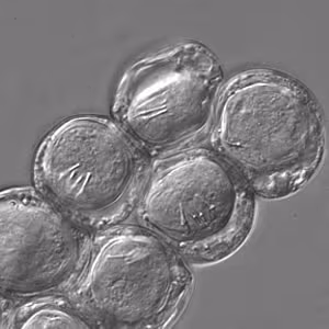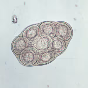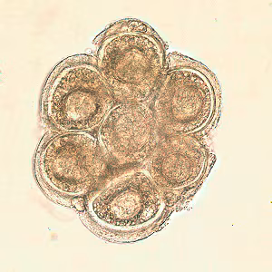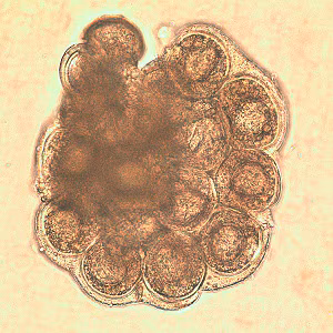 D. caninum eggs are round to oval (average size 35 to 40 µm; range 31 to 50 µm by 27 to 48 µm) and contain an oncosphere that has 6 hooklets. Proglottids of D. caninum contain characteristic egg packets that are round to ovoid and contain 5 to 15 or more eggs each.