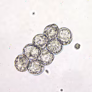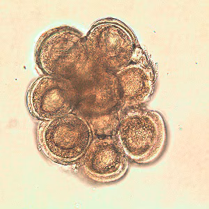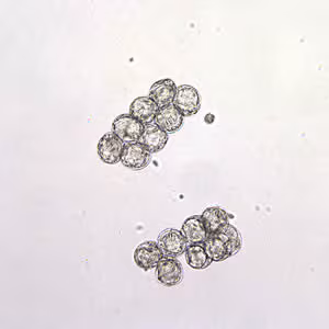 Dipylidium caninum egg packets in wet mounts.