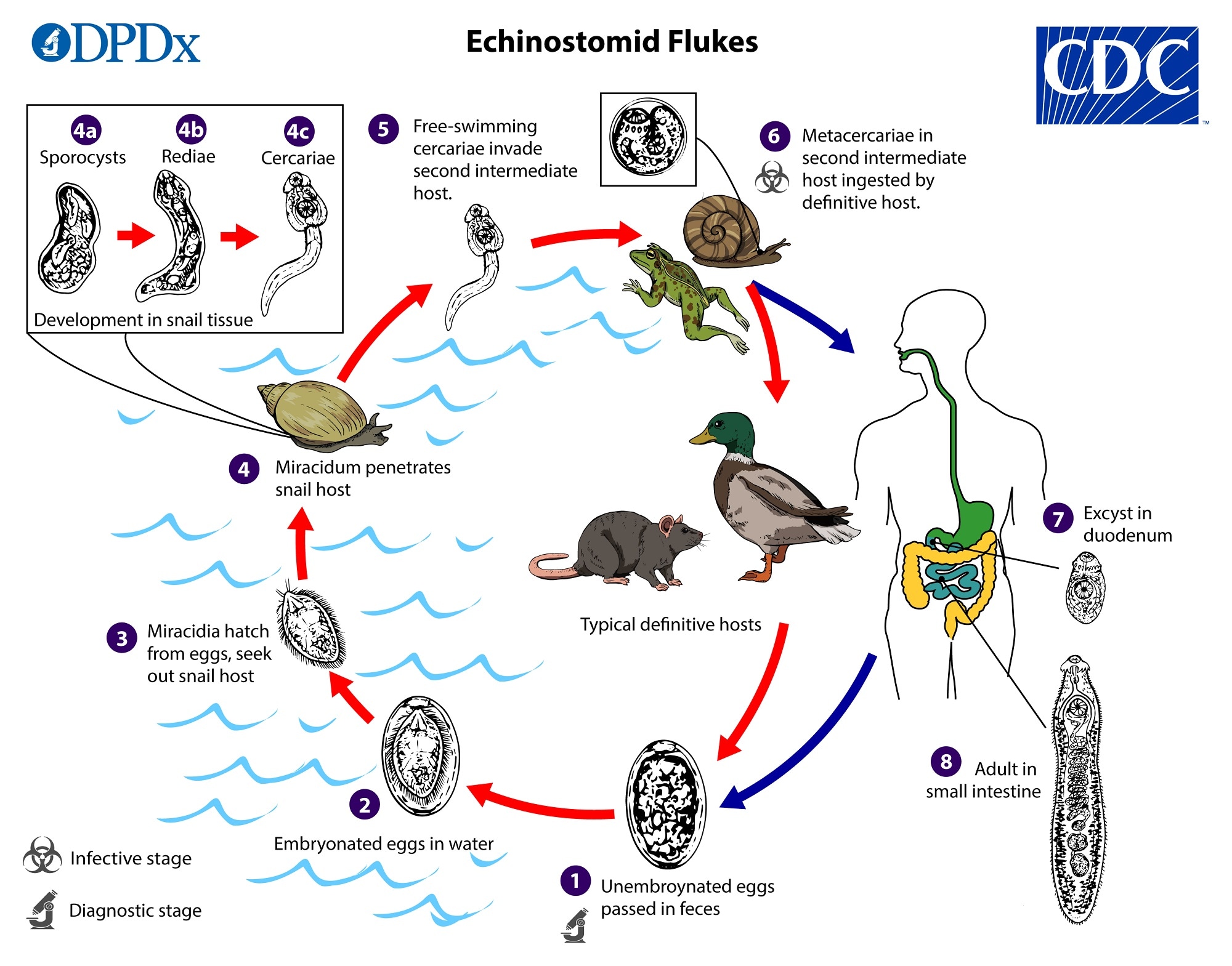 Like many trematodes, echinostomid flukes undergo a multi-host (indirect) life cycle . Unembryonated eggs are passed in feces of infected definitive hosts