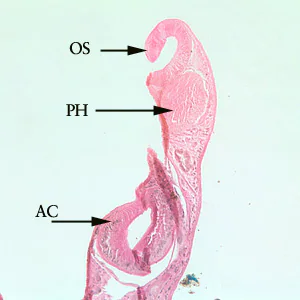 A 47-year-old male with travel history to the Galapagos Islands, Ecuador and Colombia presented to his health care provider with follicular conjunctivitis. A worm-like object measuring approximately 3.0 mm was removed from his eye and sent to a pathology laboratory for analysis. The object was sectioned, stained with hematoxylin and eosin (H&E) and examined microscopically. Figure A shows the object at 40x magnification; Figure B shows a close-up of one end of the object at 100x magnification. What is your diagnosis? Based on what criteria?
