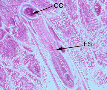 A four-year-old child was admitted to the hospital for sever abdominal pain mimicking appendicitis. A small section of bowel was removed and sent to the Pathology Department for work-up. A section of tissue was preserved in formalin, sectioned, and stained with hematoxylin and eosin (H&E). Images A–C show what was observed at 100x magnification of slides made from the tissue specimen. In addition to the biopsy, stool was collected for routine ova and parasite (O&P) examination. The object is Figure D, which measured on average 73 micrometers long by 37 micrometers wide, was seen in low numbers in a concentrated wet mount from a formalin-preserved aliquot of the stool. What is your diagnosis? Based on what criteria?