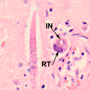 A 65-year-old patient was admitted to the hospital with fever, nausea, and vomiting after recently being treated as an outpatient for a urinary tract infection. Her past medical history included being diagnosed with bipolar disorder, hypertension, osteoarthritis, and compression fractures. She was a smoker and the only known animal contacts were her pet dogs. During hospitalization, her mental health continued to decline and she was pronounced brain-dead after one month’s stay at the hospital. CT and MRI scans of her brain prior to death did not show any focal lesions. An autopsy was performed and cultures of brain tissue were negative for bacterial and viral agents. Sections of brain tissue were processed by Pathology and stained with hematoxylin and eosin (H&E). Figures A–B show what was observed by the attending pathologist. Images were captured and sent to the DPDx Team for diagnostic assistance. What is your diagnosis? Based on what criteria?