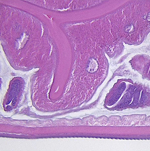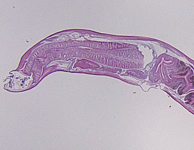 A worm-like object was removed during a routine colonoscopy performed on a 65-year-old male patient. The patient had no gastrointestinal complaints and no documented international travel. The object measured approximately 11.0 mm in length. The specimen was sent to Pathology for routine histological work-up, including sectioning and staining with hematoxylin-and-eosin (H&E). Digital images were captured and sent to the DPDx Team for diagnostic assistance. Figures A–D show four of the images sent for consultation. Follow-up ova-and-parasite (O&P) examinations of stool were negative. What is your diagnosis? Based on what criteria?