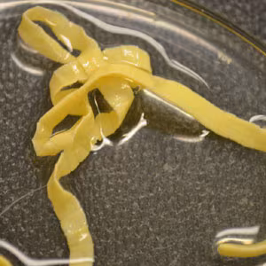 A 49-year-old female passed a worm-like object approximately three weeks after attending a Thanksgiving potluck for 200 people. Prior to the Thanksgiving meal, the patient had experienced diarrhea for two weeks. The worm was presented to a local hospital. Follow-up stool ova-and-parasite (O&P) examinations were negative. The Microbiology Department took digital images (Figures A–C) of the worm and sent them to the DPDx Team for diagnostic assistance. The initial finding from the images was reported simply as ‘cestode’ and the specimen was forwarded to the DPDx Team for further study. Upon arrival, the specimen was placed in lactophenol for clearing. Figures D and E show what was observed in the proglottids after clearing for two days. The objects measured 60 micrometers in length on average. What is your diagnosis? Based on what criteria?