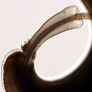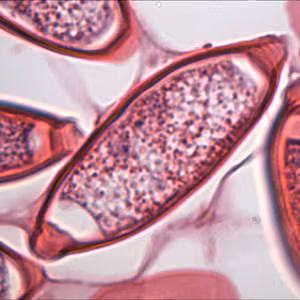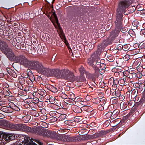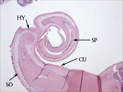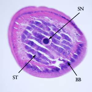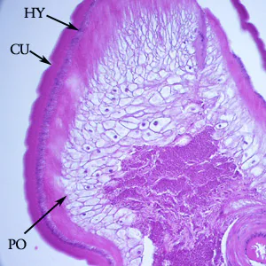 Cross-sections of T. trichiura stained with hematoxylin and eosin (H&E).