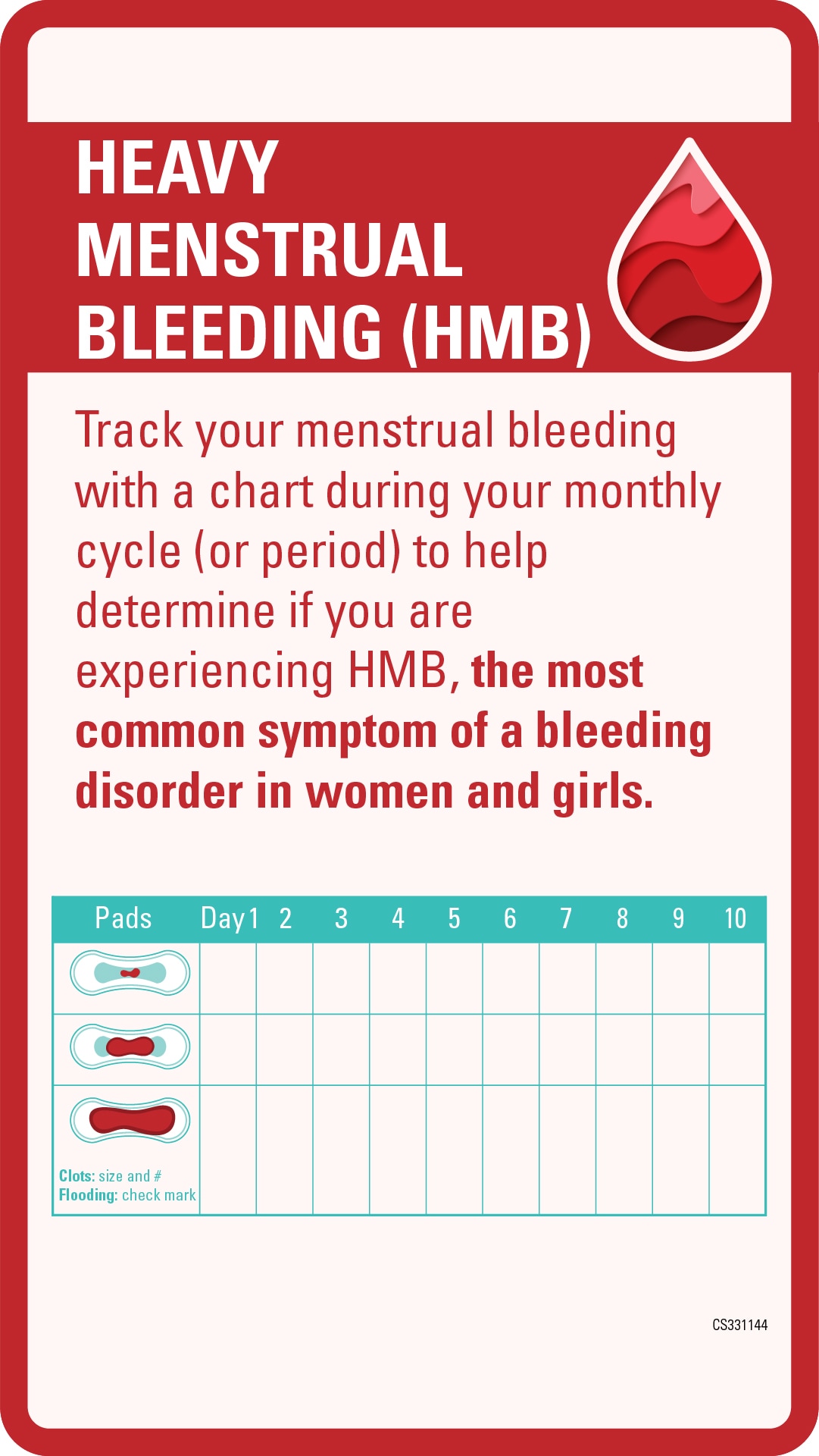 Track your menstrual bleeding with a chart during your monthly cycle (or period) to help determine if you are experiencing HMB, the most common symptom of a bleeding disorder in women and girls.