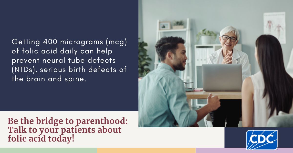 Getting 400 mcg of folic acid daily can help prevent neural tube defects (NTDs). Providers can be the bridge to parenthood by having conversations with young adults about folic acid. Use this graphic and sample message to help providers prepare patients for their "parenting era".