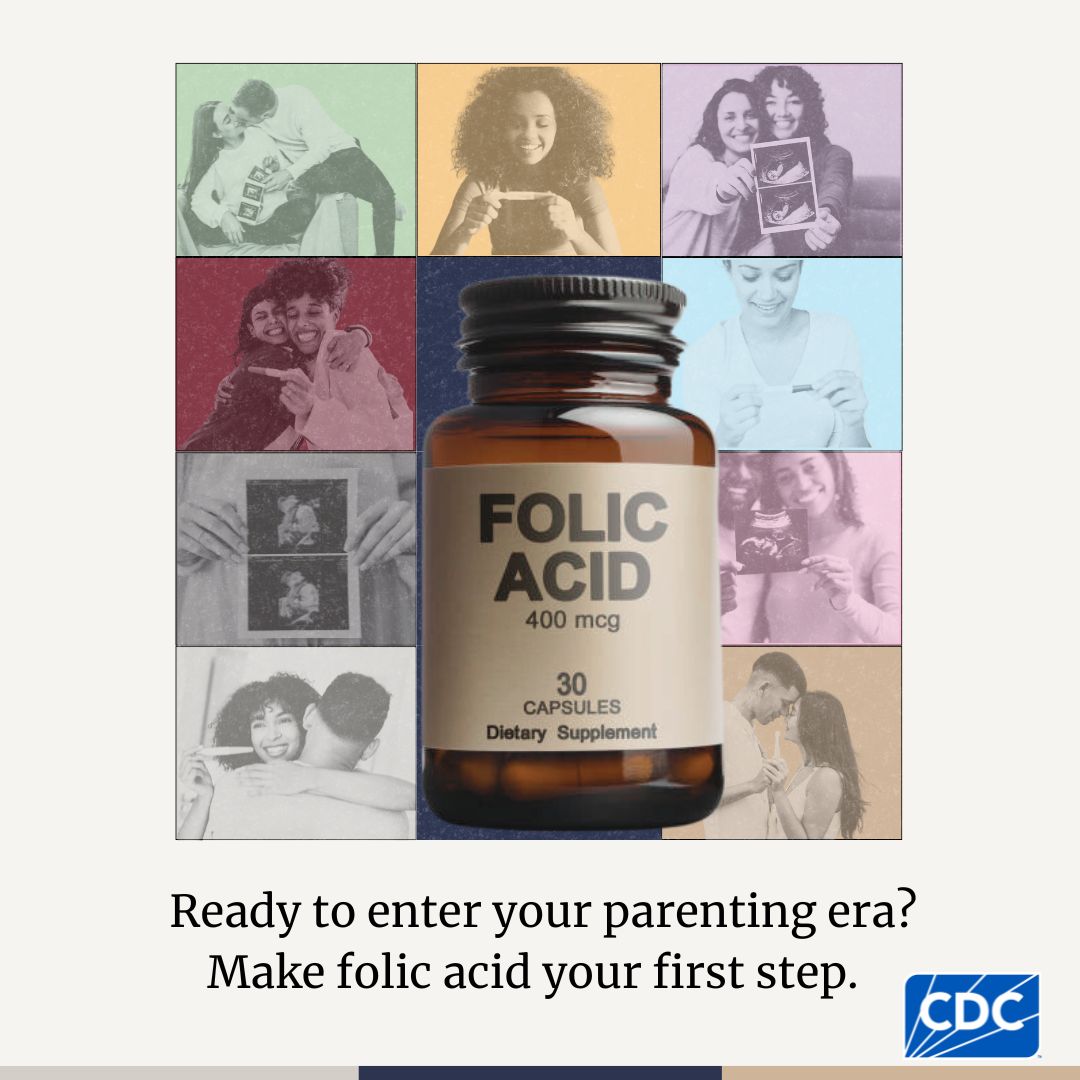 The first step in planning for your "parenting era" is to get 400mcg of folic acid daily, which can prevent serious defects of a baby's brain and spine. Use this graphic and sample message to spread awareness about the importance of taking folic acid before pregnancy.