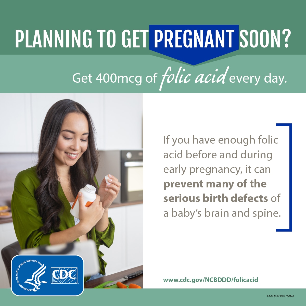 Starting a family is an exciting time! Make sure you're taking care of yourself and your future baby by getting enough folic acid. Taking 400 mcg of folic acid each day before and during pregnancy can help prevent serious birth defects of the brain and spine. #FolicAcid #PowerToPrevent