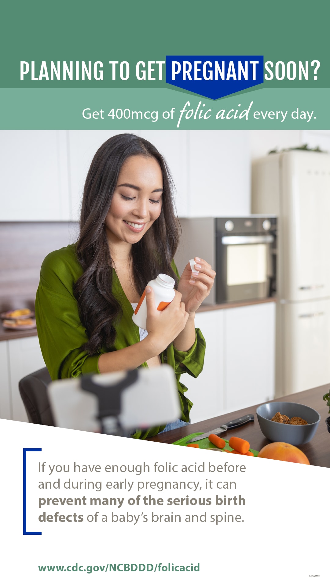 Hispanic/Latina women are more likely to have a child born with a neural tube defect (NTD) than non-Hispanic White and Black women. Getting 400 mcg of folic acid daily before and during early pregnancy can help reduce the risk of NTDs. Use the graphic and sample message on your various platforms to help raise awareness about folic acid among Hispanic/Latina women in your community.