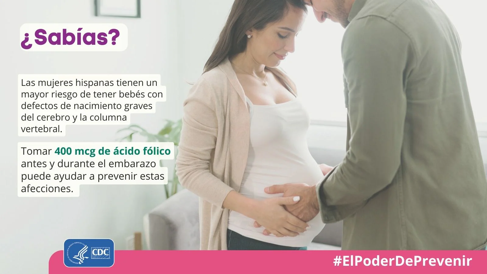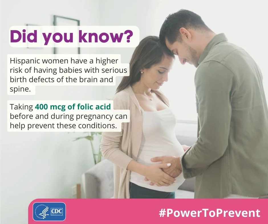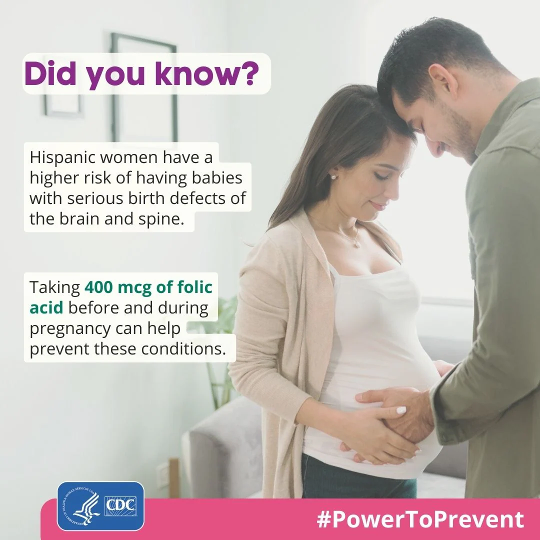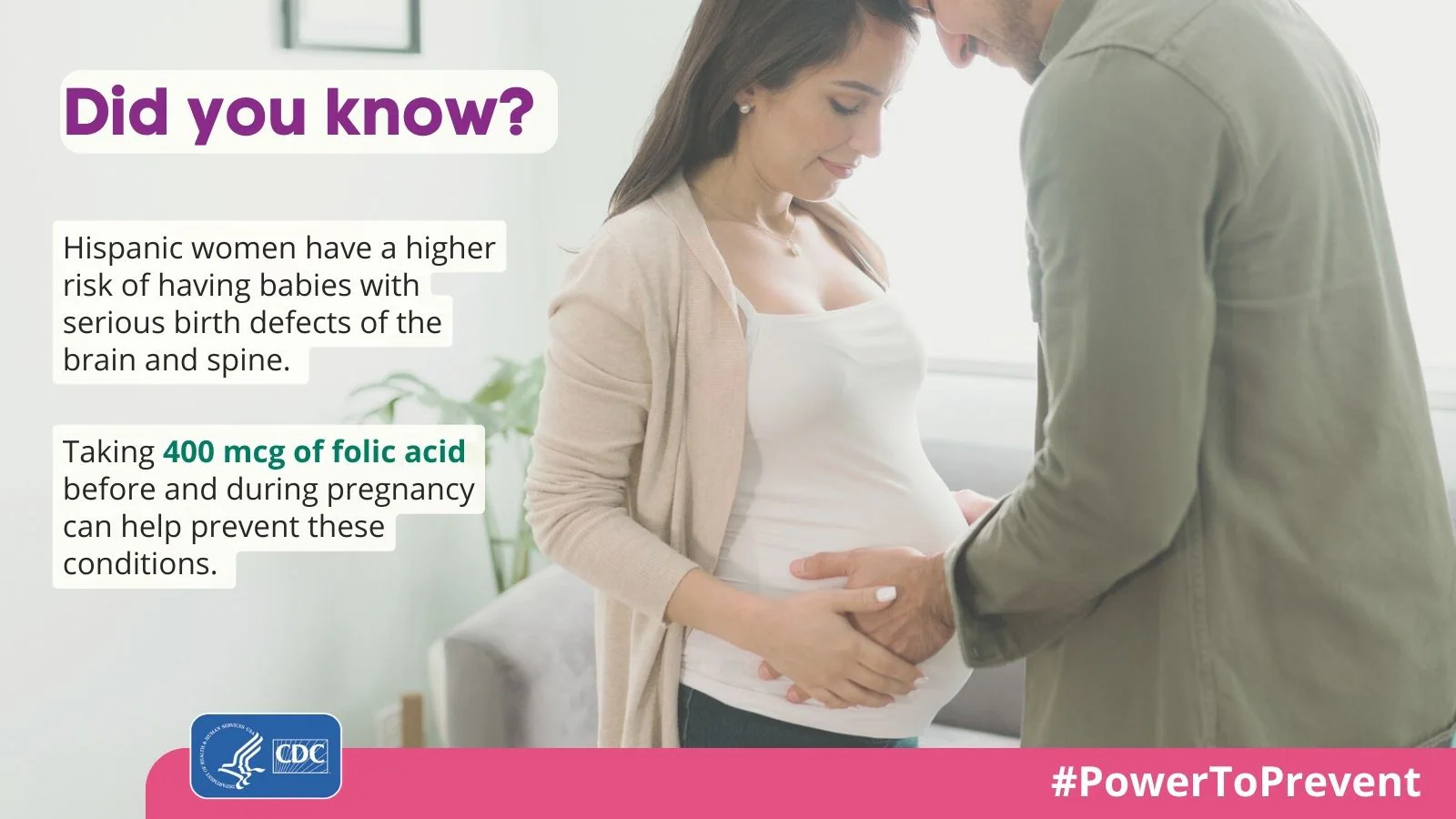 Hispanic/Latina women are more likely to have a child born with a neural tube defect (NTD) than non-Hispanic White and Black women. Getting 400 mcg of folic acid daily before and during early pregnancy can help reduce the risk of NTDs. Use the graphic and sample message in English and Spanish on your various platforms to help raise awareness about folic acid among Hispanic/Latina women in your community.